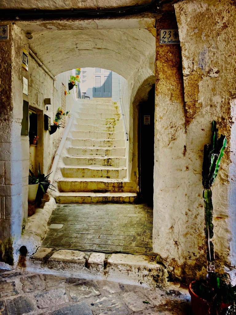 Strahlend weiß gekalkte Hausfassaden, die die engen Gassen vor der Sommerhitze und die Menschen im Mittelalter vor Krankheiten wie der Pest schützen sollten. In schattigen Ecken und Winkeln gedeihen prächtige mediterrane Pflanzen. Treppen, Bögen, Durchgänge, in den Gassen kann man leicht die Orientierung verlieren. Überall ist der Hauch der Jahrhunderte zu spüren.